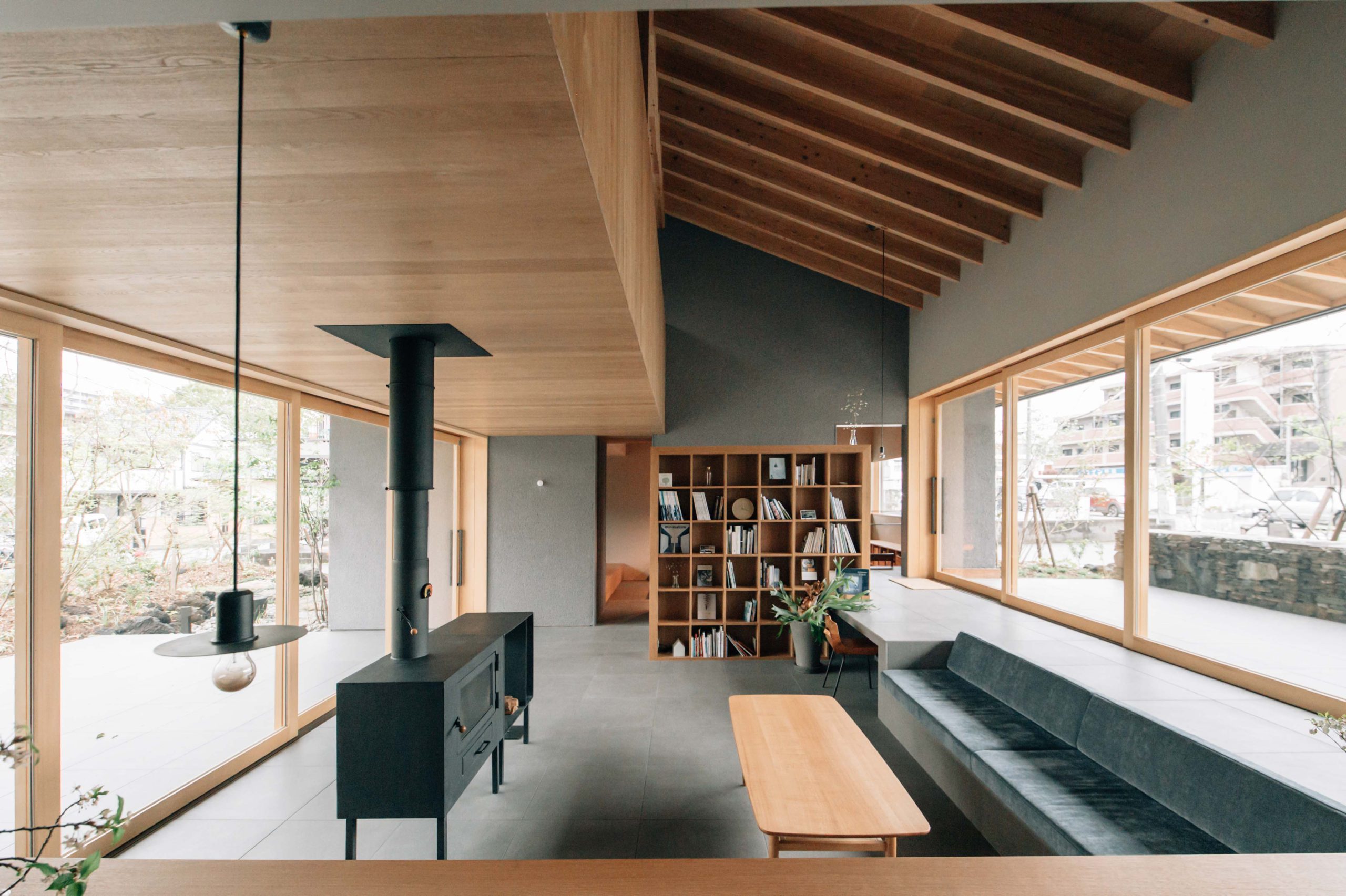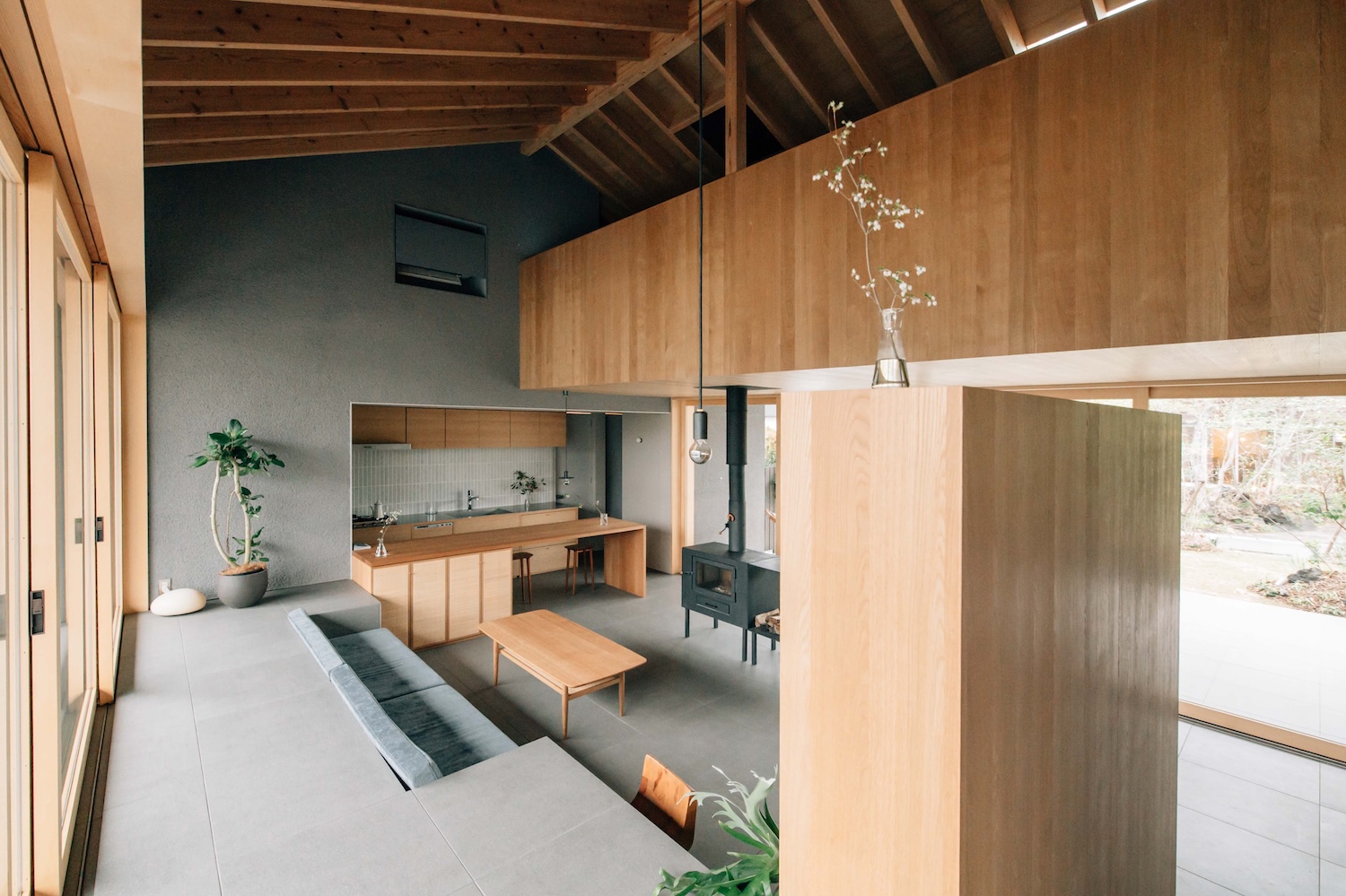 ドアを開ければ、清々しい小国杉の香り。 深い軒下が作り出す半屋外の空間や、あえて室内に用いた外壁や土間が、内と外との境界線を曖昧にし、自然の中にいるような心地よさ。