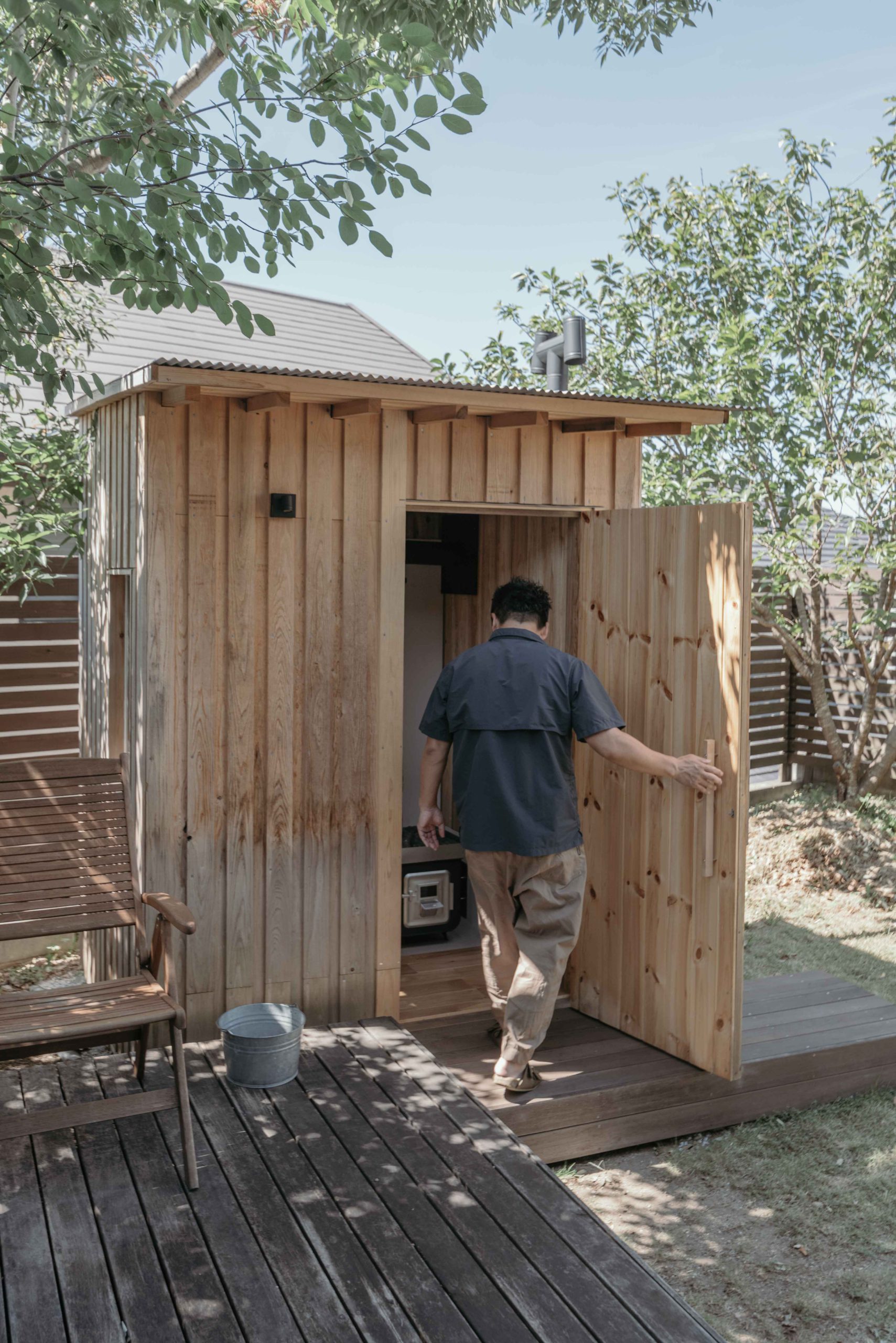ウッドデッキにサウナ小屋をDIYし、心地よく、楽しい暮らしへと手を加えているスタッフ牟田口のお庭。