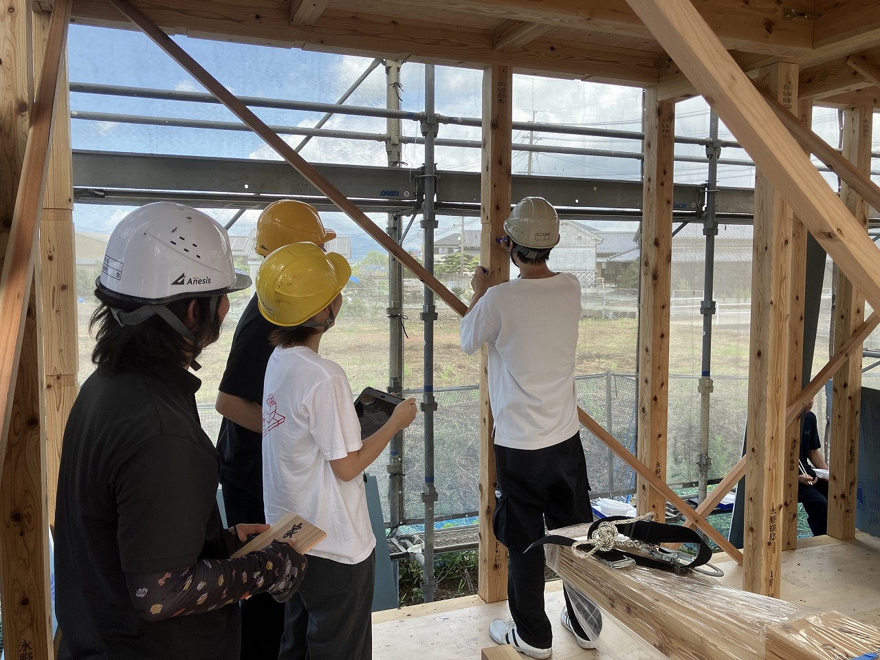 はじめて設計として担当した 堤くんがお客様に勧めていただいてペンをにぎっています。