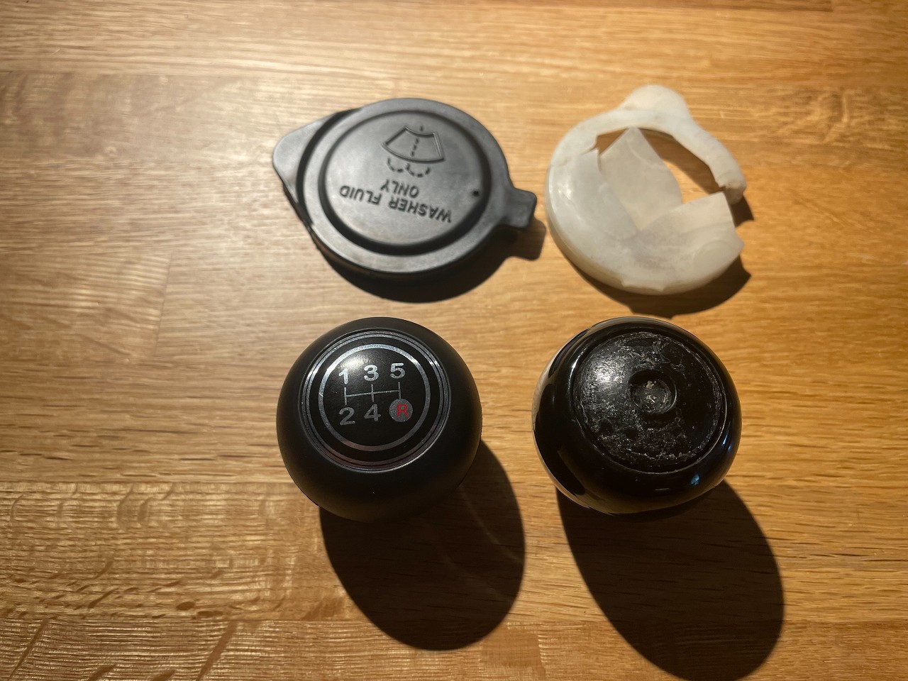 たまごくらいのサイズの純正シフトノブですが、印字が長年の利用で削れてしまい、しまいにははがれてしまいました。