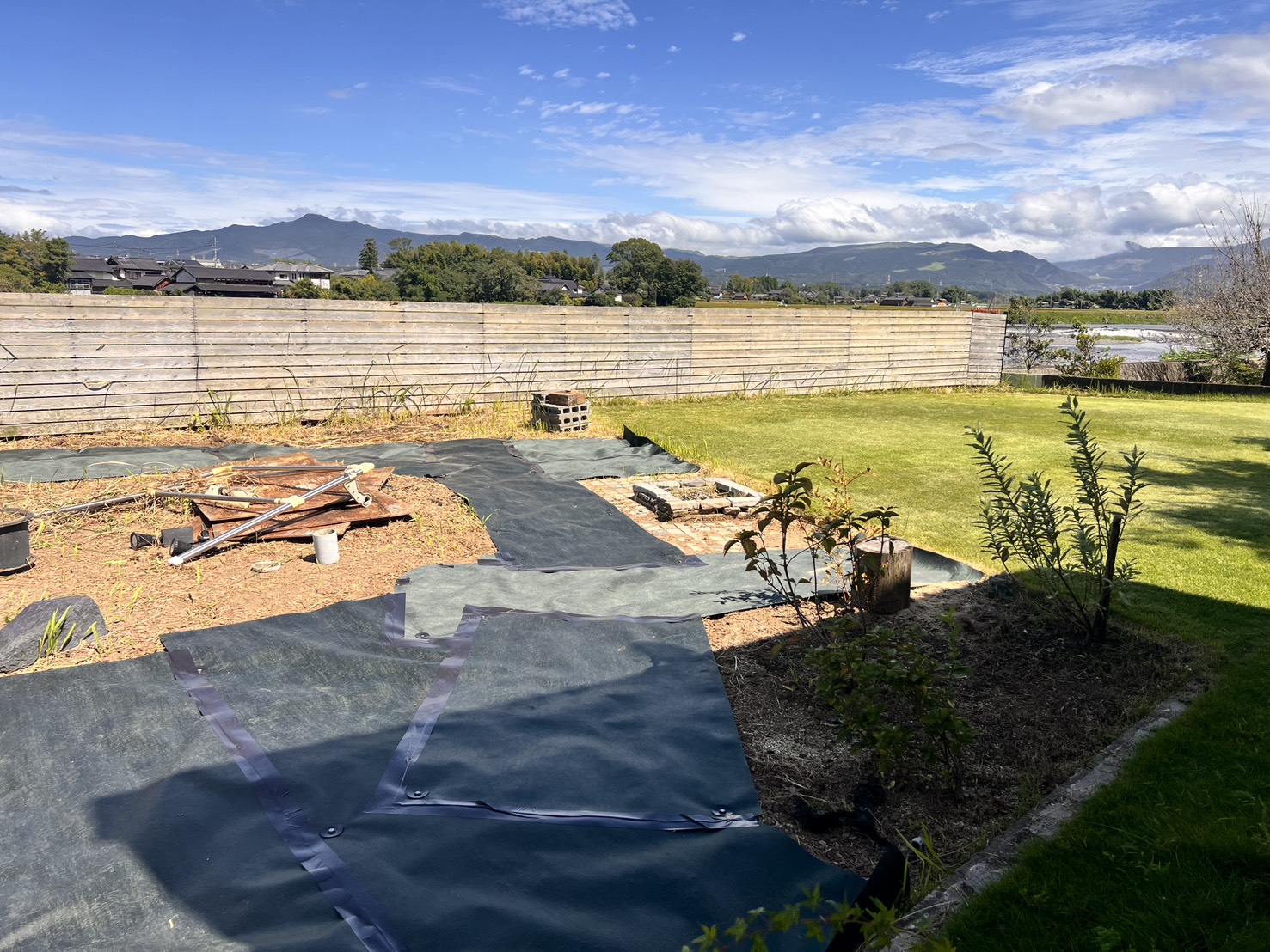小道ゾーンにシートを敷き終わり、これで強靭な雑草たちを収めることができるはず。防草シートの上にはウッドチップを敷き詰める予定です。