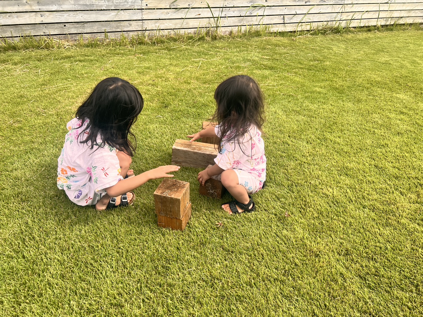 お手伝いに飽きたらカットしていた角材で積み木です。子供の外遊びの発想は無限大。