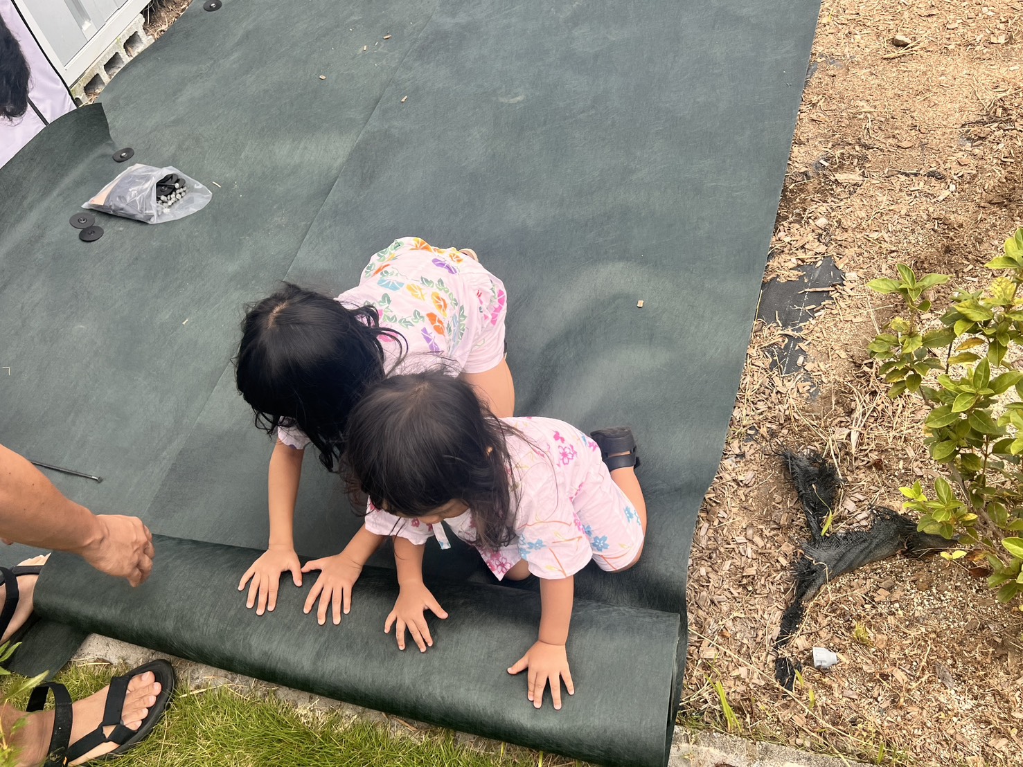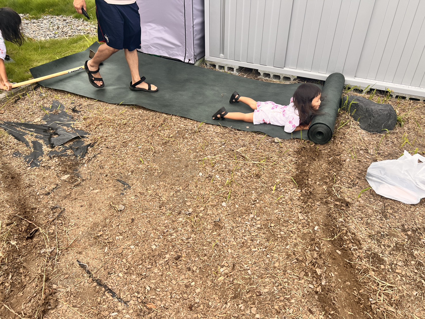小道になる部分にには防草シートを敷きます。我が家の雑草たちは生命力に長けているためちょっとグレードの高い防草シートで挑みました。娘たちも(自称)お手伝い。