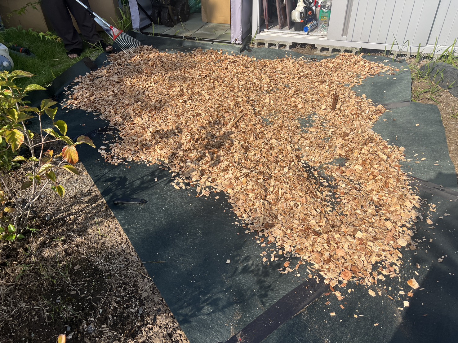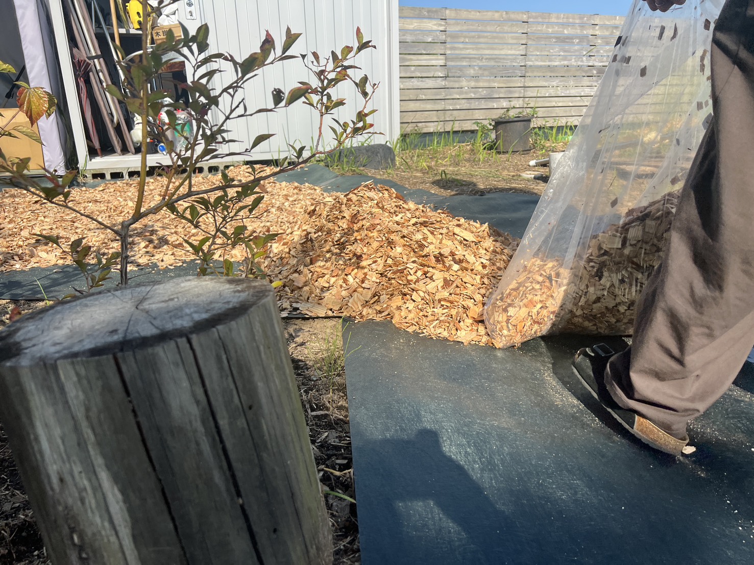 また別の日。注文していたウッドチップが届いたので敷き詰める作業。草刈りやシートを敷く作業よりもラクだし楽しい。