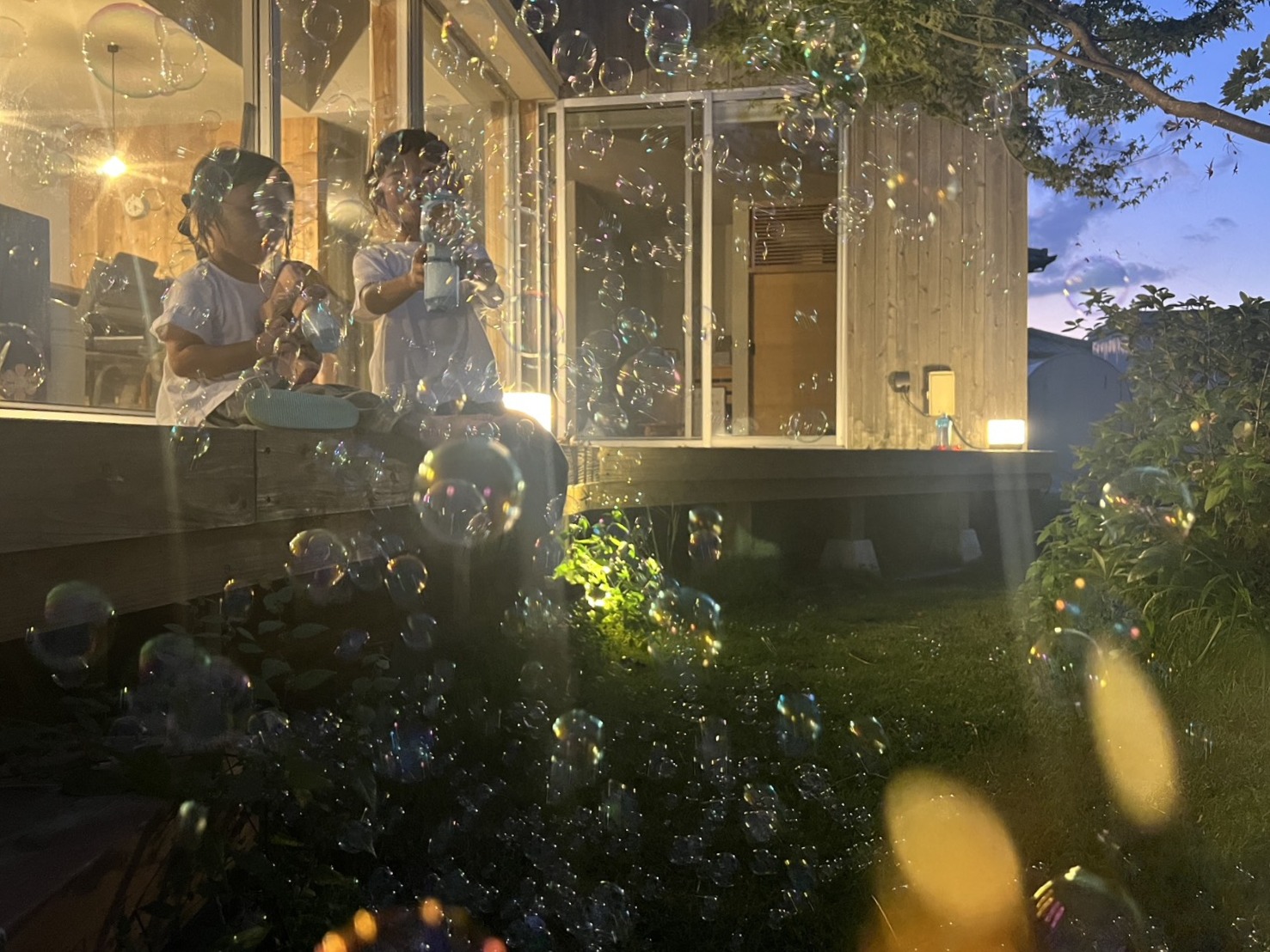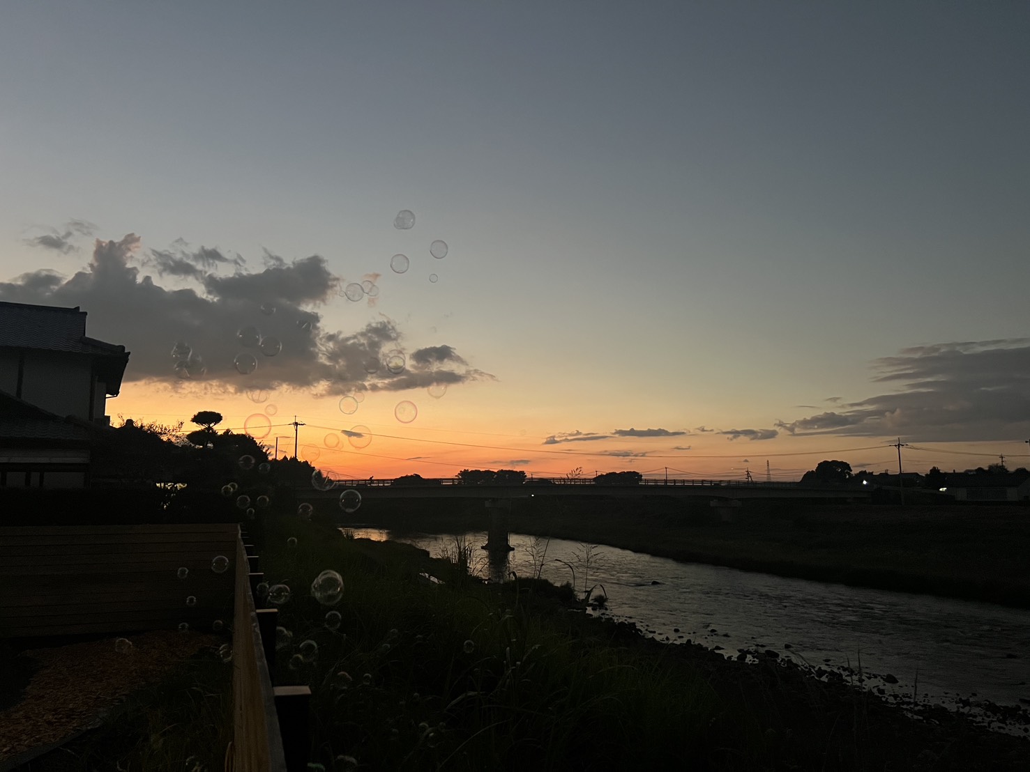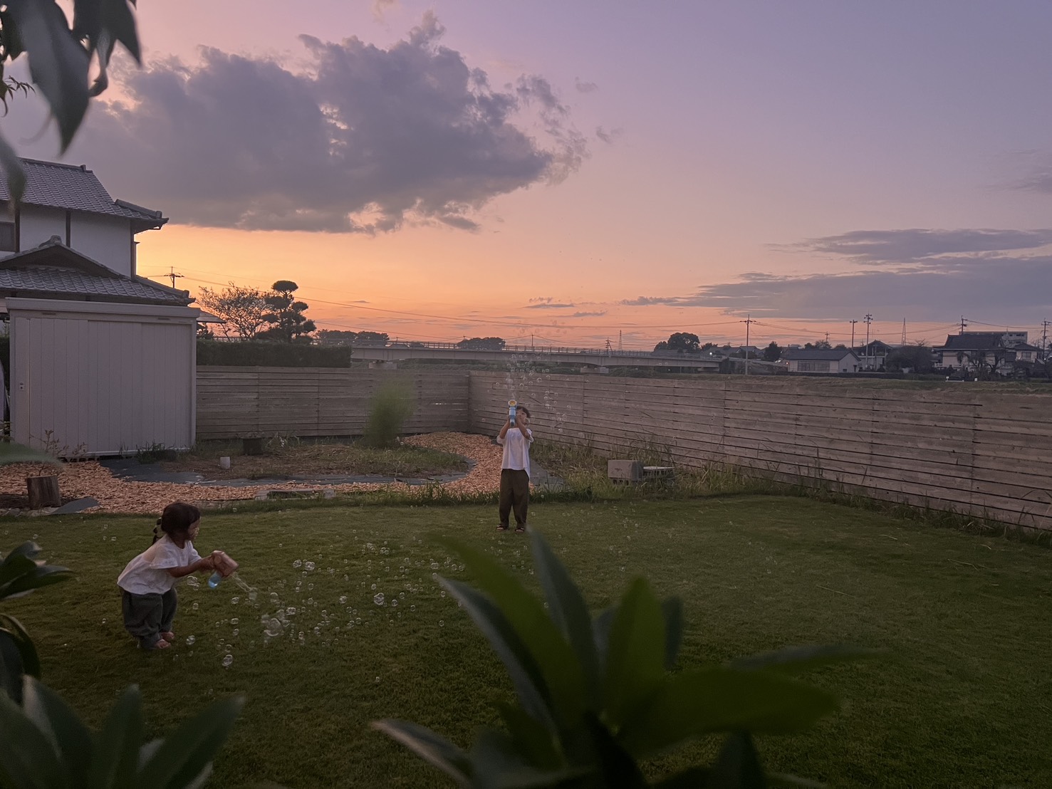 夕方が涼しい時期になったので休日の夕飯前に庭でひと遊びするのがお決まりになりつつあります。我が家・白川ビューは北と東に開いた家なので室内から西の空を眺める事は難しいためこの時期の夕焼け空を楽しみに庭で遊ぶのも良いなあと思いました。夕焼けとシャボン玉の共演が癒しです。
