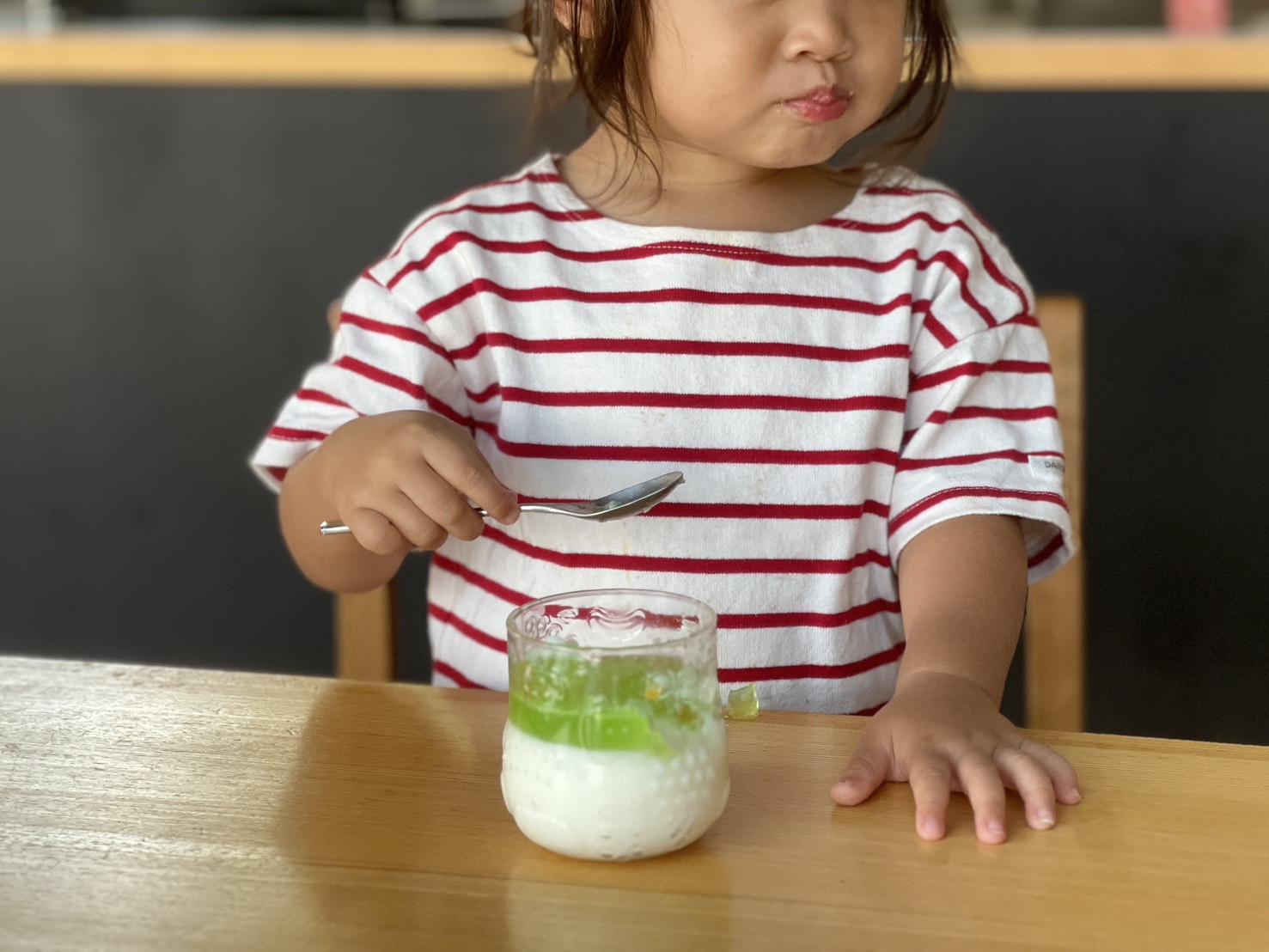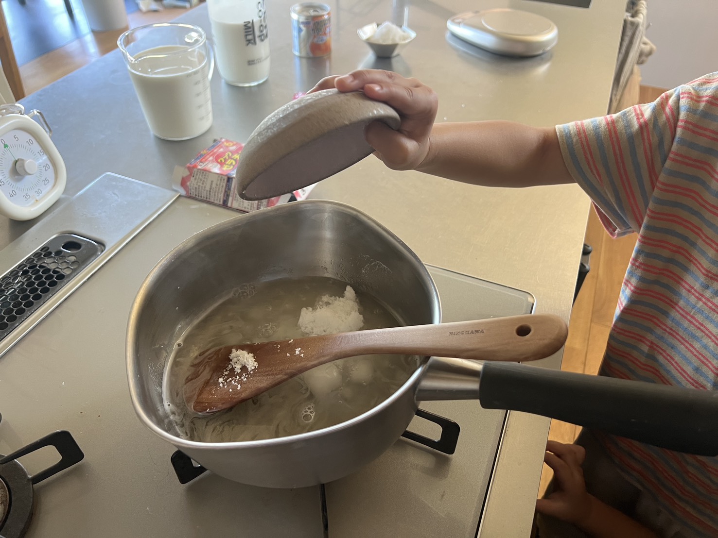 交渉の末、室内で過ごす時間を勝ち取った先日のお休みはまだまだ暑かったので冷たいおやつを作ることに。こんな日に備えて夜な夜な「おやつ 子供とつくる」で検索に励んでネタをストックしており、今回はこどもおやつ工房さんのYouTubeからキラキラ牛乳寒天をつくりました。