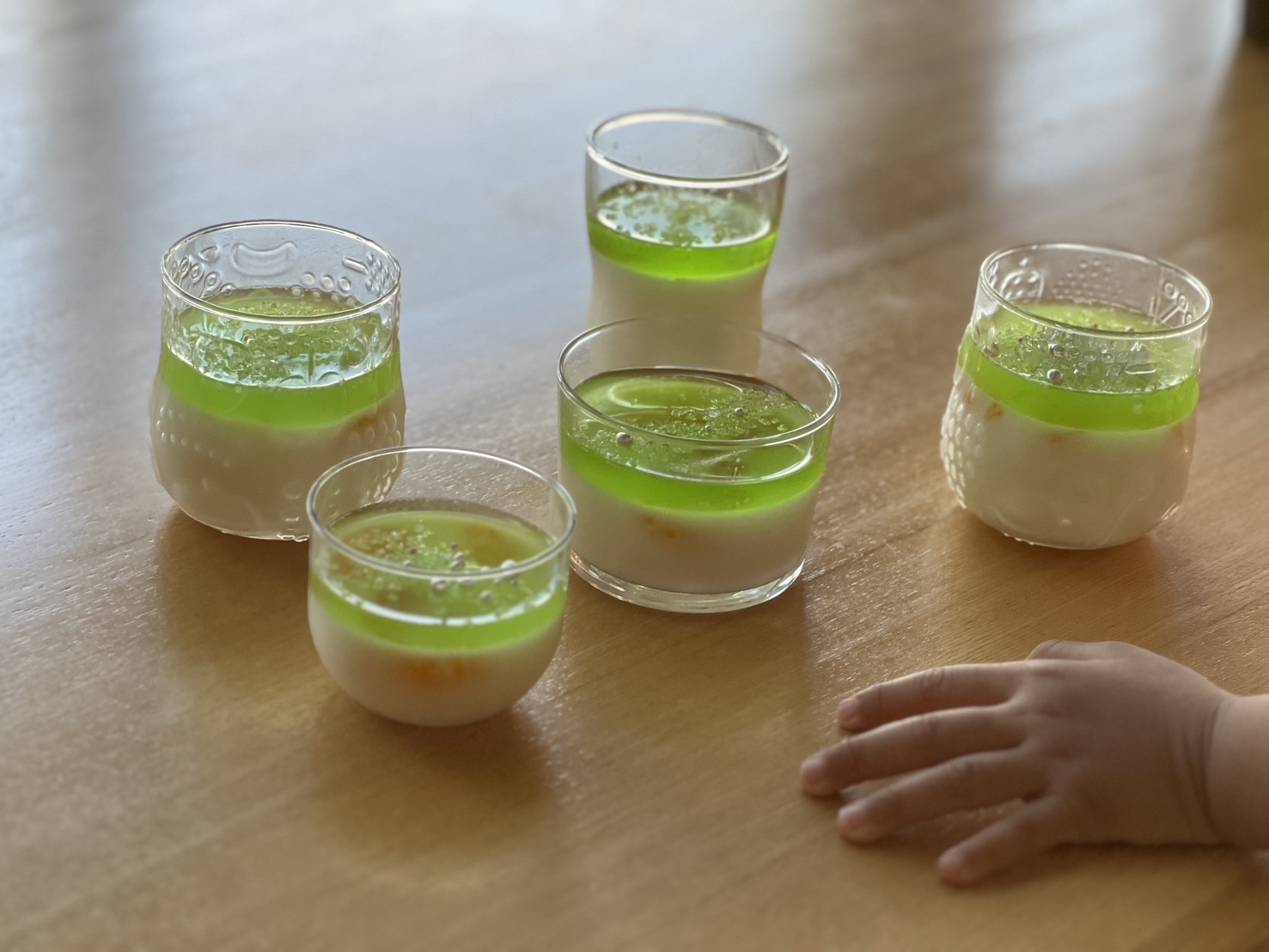 昼食を終えたら牛乳寒天が固まっているのを確認し次の工程へ。上にのせるゼリーをつくります。冷蔵庫にメロン味のかき氷シロップが残っていたのでそちらで作りました。目が覚める鮮やかさです。