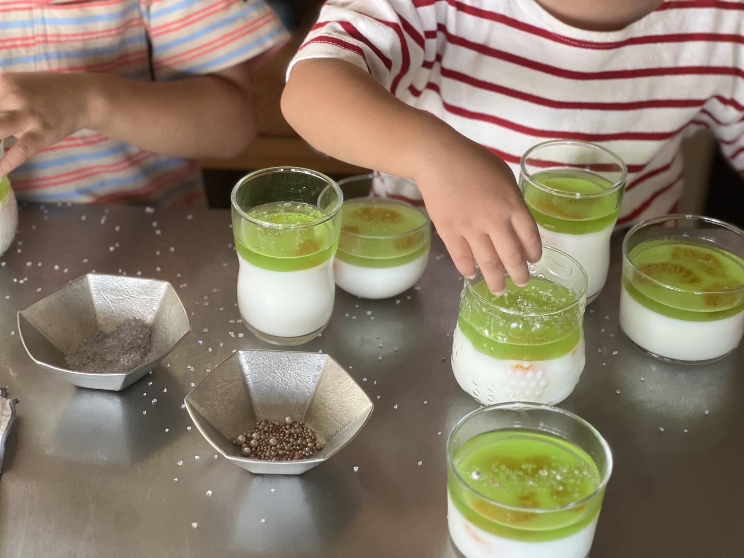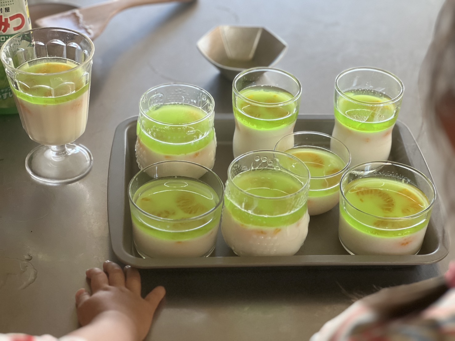 無事に完成、そして待望のおやつタイム。大人にはかき氷シロップのゼリーは少々甘すぎましたが子供は美味しかったようです。次は上のゼリーはぶどうジュースやメロンサイダーで作っても良いなと感じました。