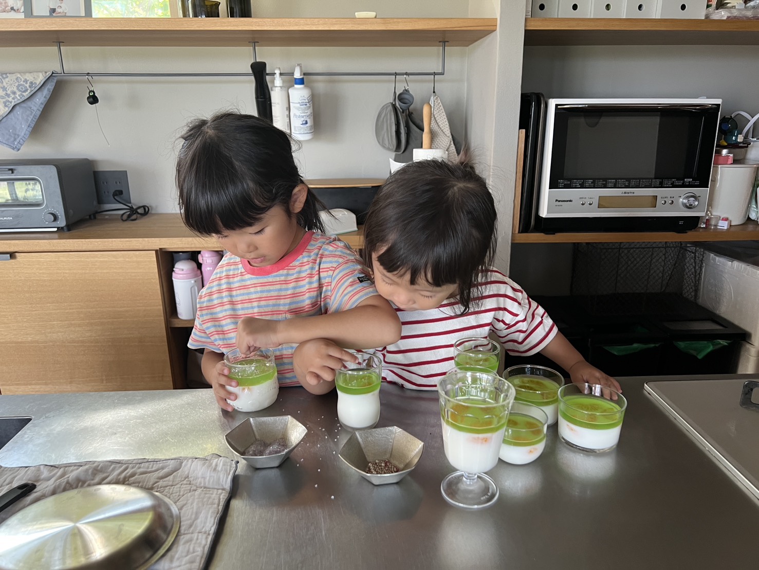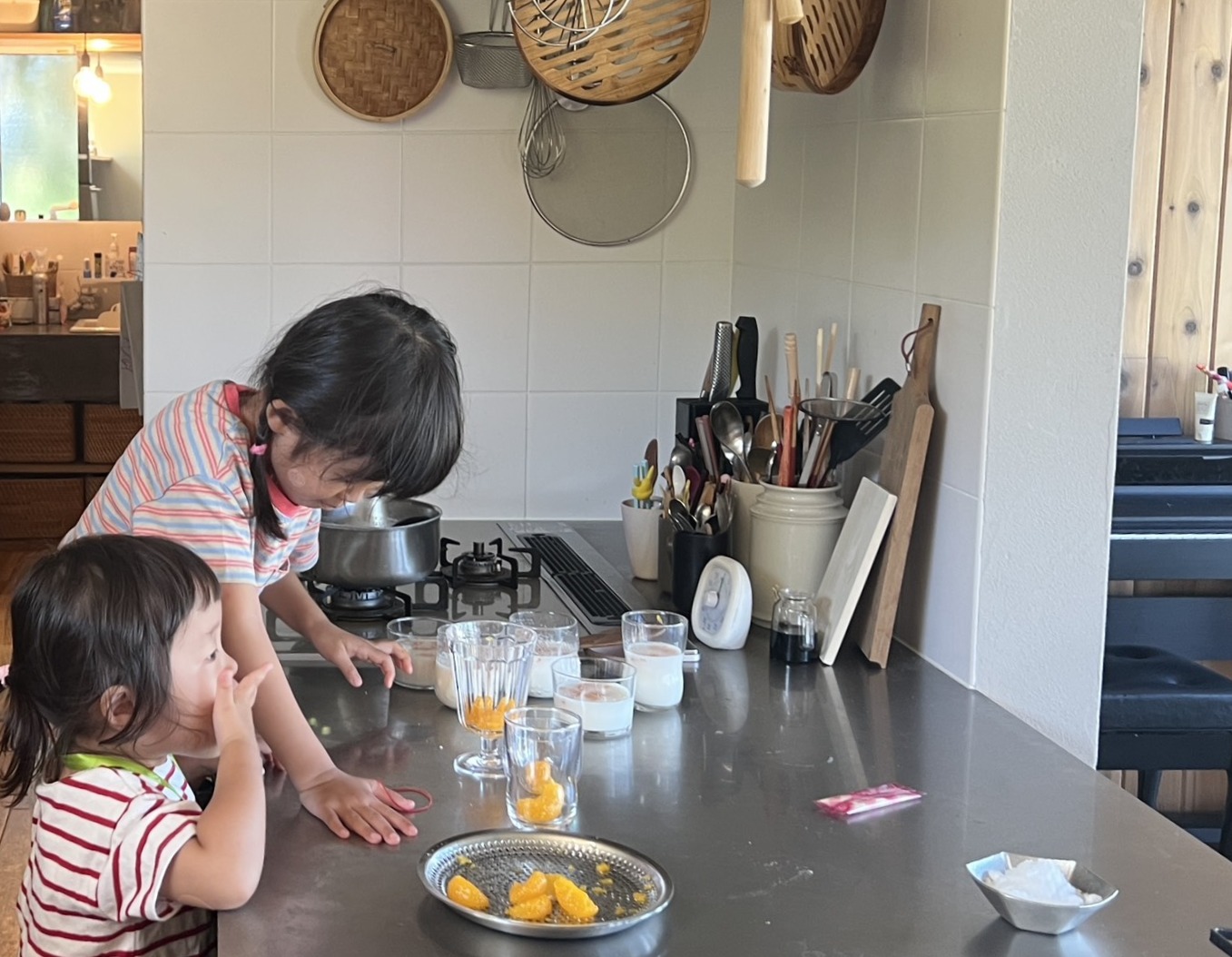 寒天を持ち合わせておらず家にあった粉ゼラチンで代用してまずはミカン入りの牛乳寒天づくり。長女は真面目で伝えた作業をもくもくとこなしていきます。次女はそんなお姉ちゃんの背後で興味のあるものへまっしぐら。
