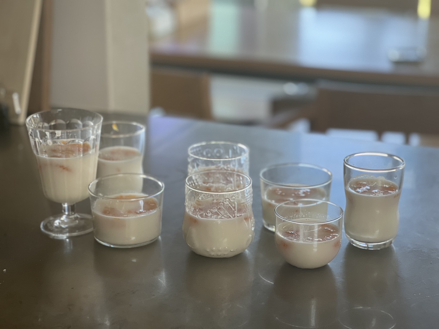 ミカンを入れたグラスに牛乳寒天をそそぎ冷やし固めます。固まるまで私たちも昼食タイムへ。