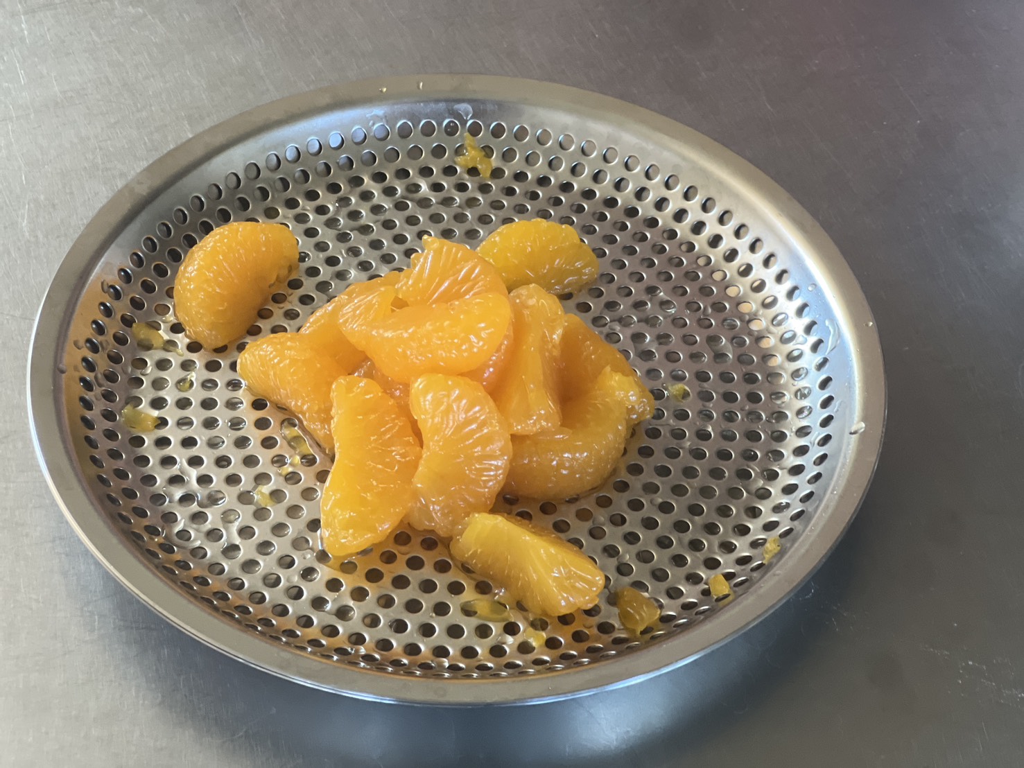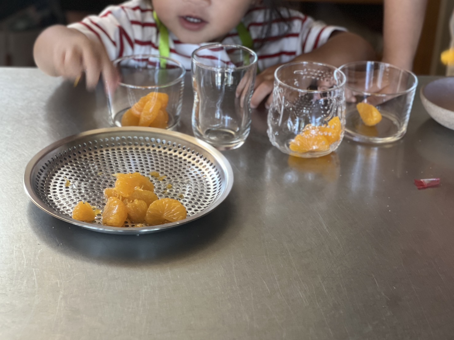 大好きなミカン缶が登場したあたりからやっと次女もやる気モードに。牛乳寒天を入れる器にみかんを入れていきます。つまみ食いの方が多かったように感じますがそれも子供とお料理をする醍醐味ですね。