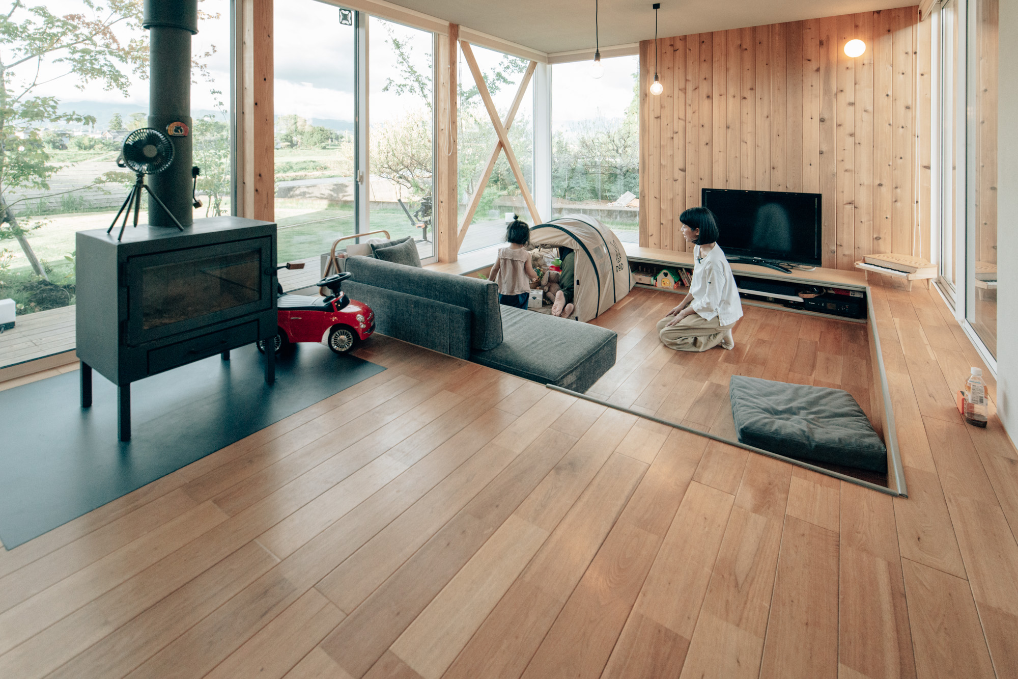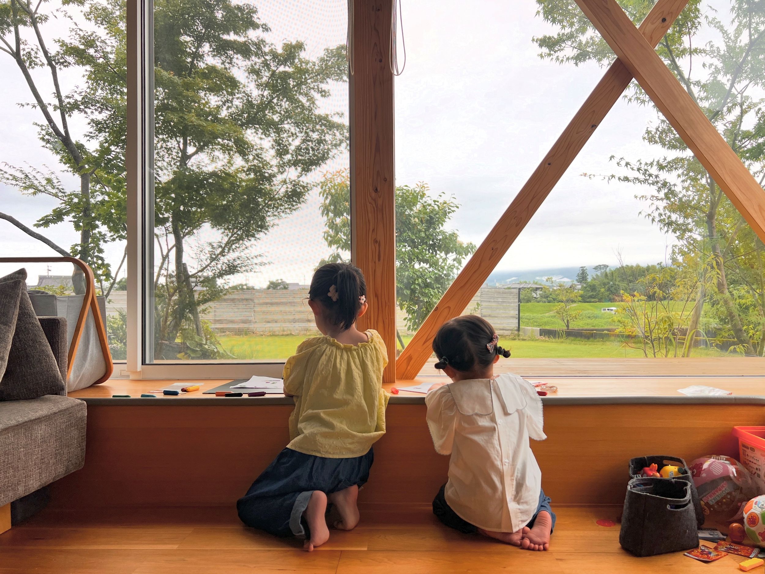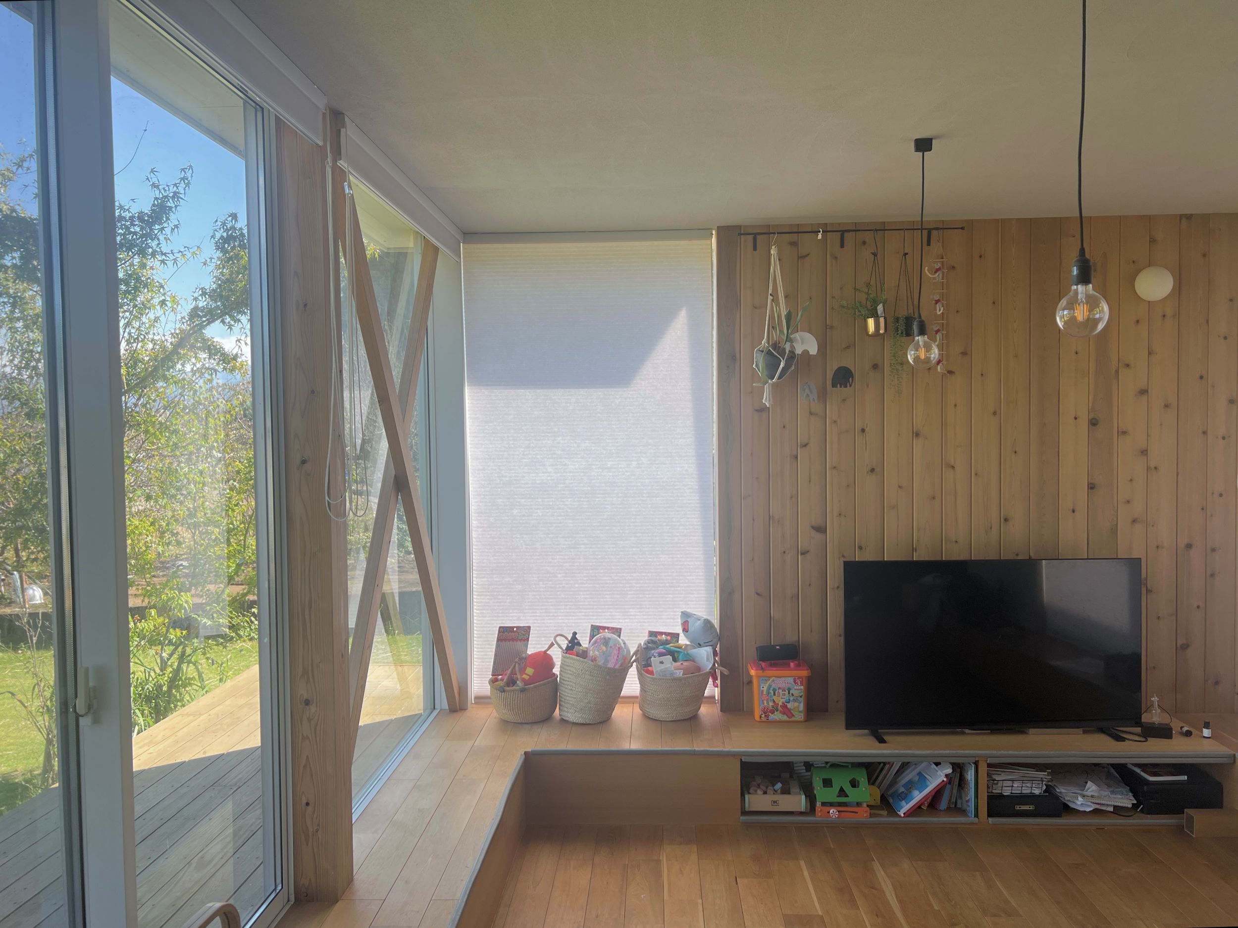 我が家のリビングは段下がり。段下で寛ぐ時に庭の木々や下草、芝生、溶岩石、苔などに視線が近くなれば良いなという想いもありこのプランになりました。段上を机にしてお絵描きをしたりおままごとをして遊ぶのが子供たちのリビングでの過ごし方です。