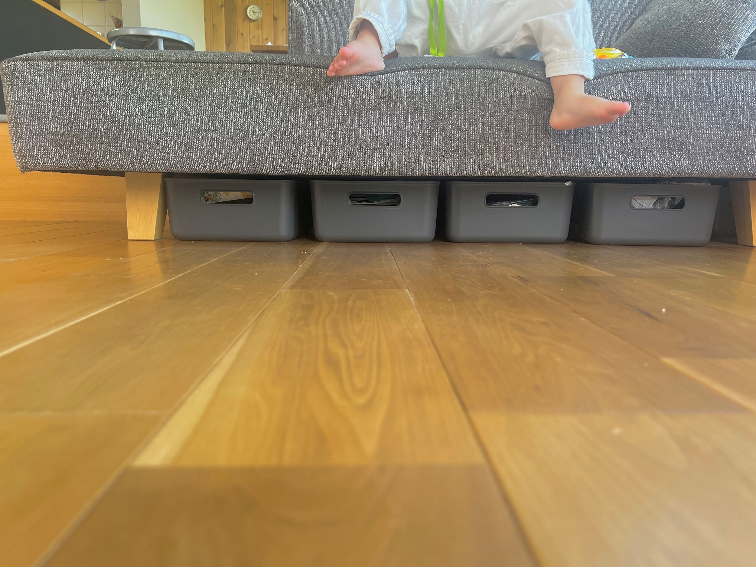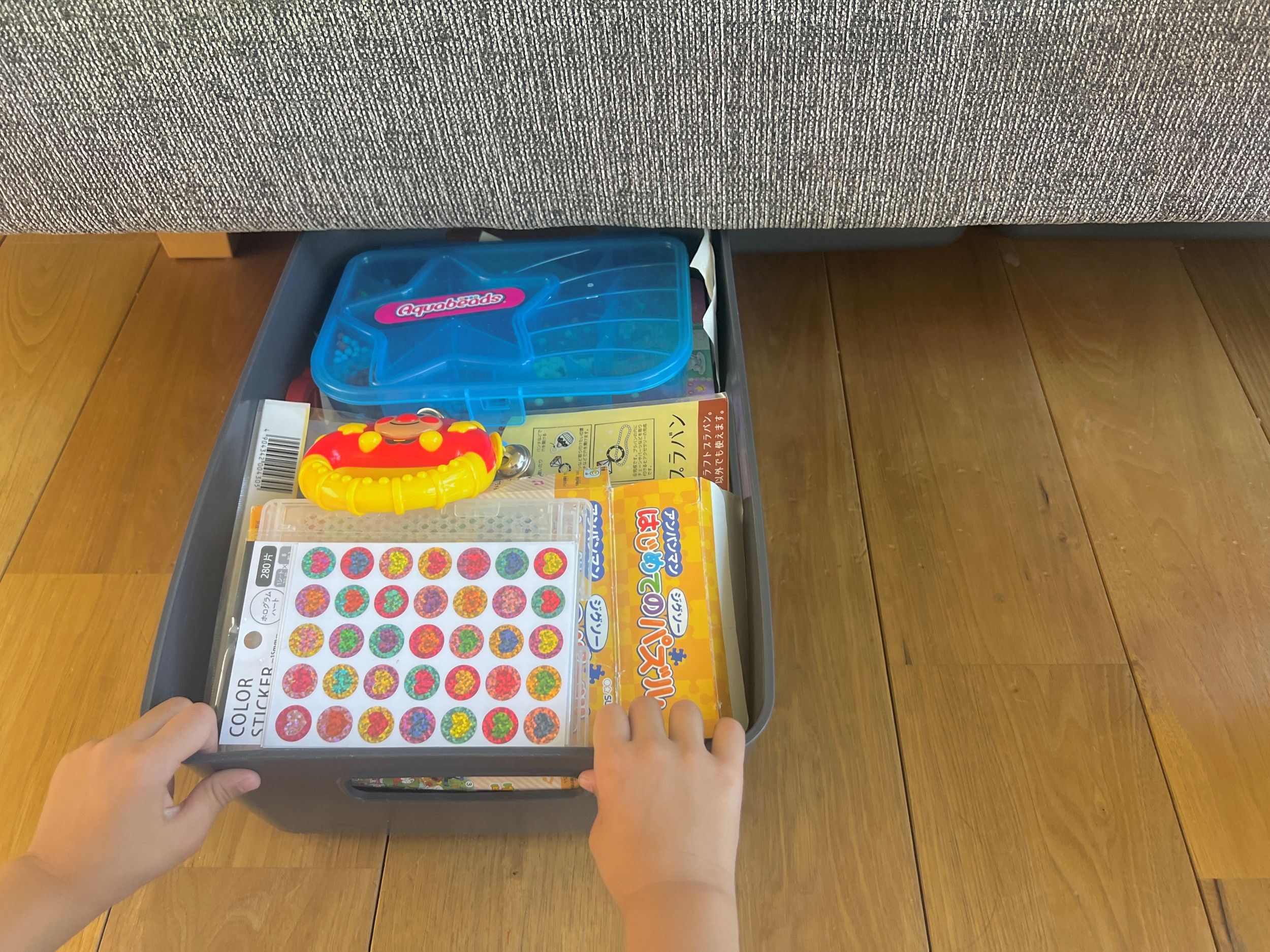 ただこのスペースだけに日々増えていくリビングまわりのおもちゃ類が収まるわけがなく、入居後いろいろと試行錯誤をしながら生活しています。隠し収納としてはソファの下に高さがジャストサイズのボックスを購入し、ここに溢れたおもちゃ(パズル、スライム、粘土、シール、その他こざこざ)を収納。ここも子供たちが自由に出し入れしています。ボックスを4つソファ下に忍ばせているので、ローソファで高さはあまりありませんが子供用の収納量がぐっと増えました。