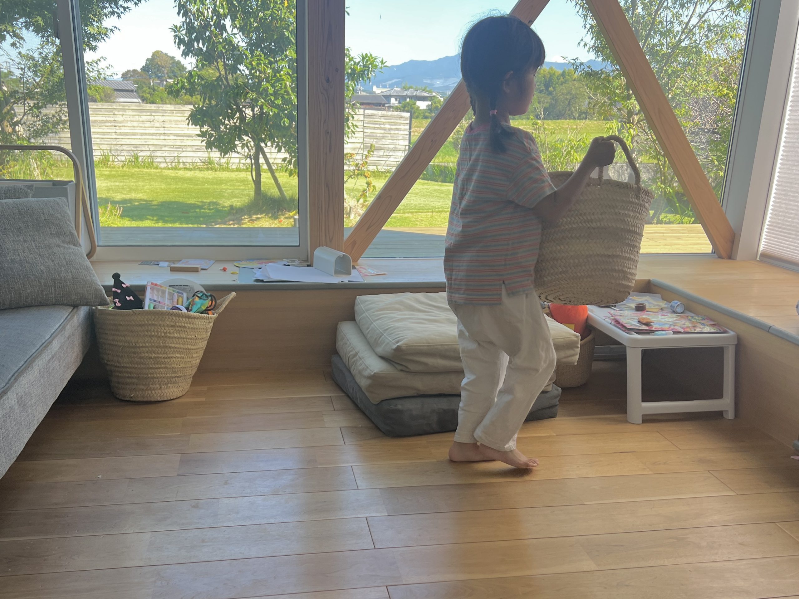 特に2歳児にはこのルールが浸透するはずがなく、リビングが荒れることもしばしばですがものの収納場所が決まっているので、床に転がっているぬいぐるみを気づいた時に大人もちゃちゃっとカゴに収納出来るので助かります。