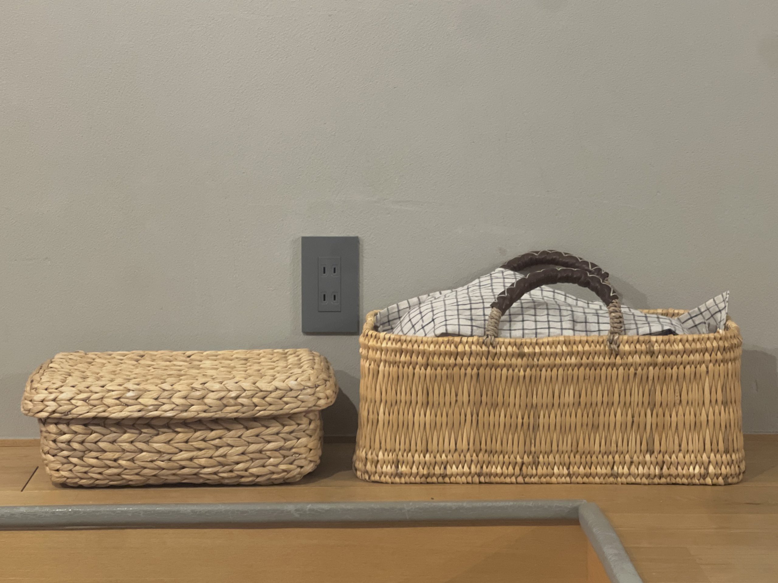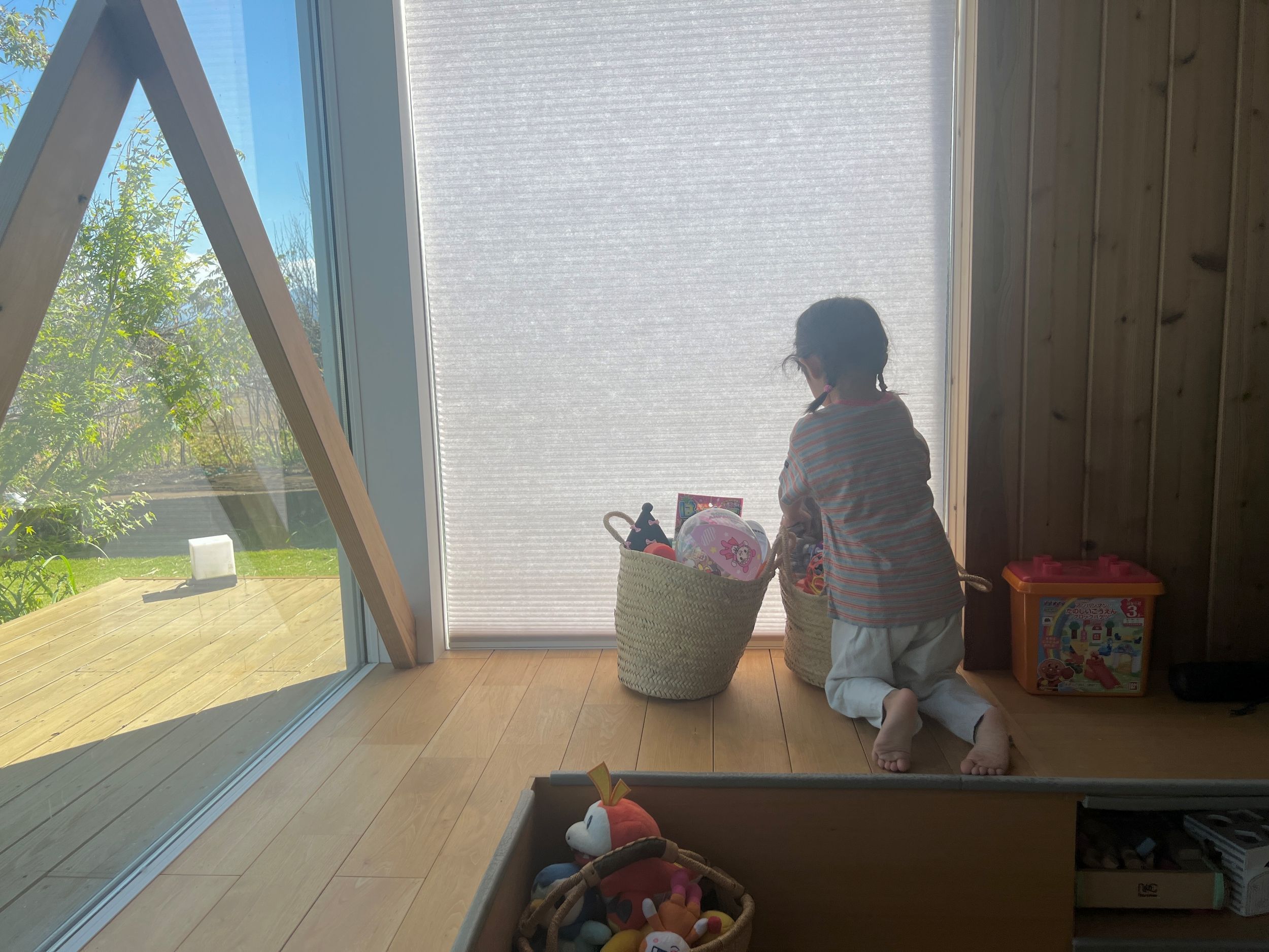 △段上のカゴや箱はこの日、お片付けチャンピオンが段下で広々遊ぶために置いていました。その日その日でカゴたちは移動しています。