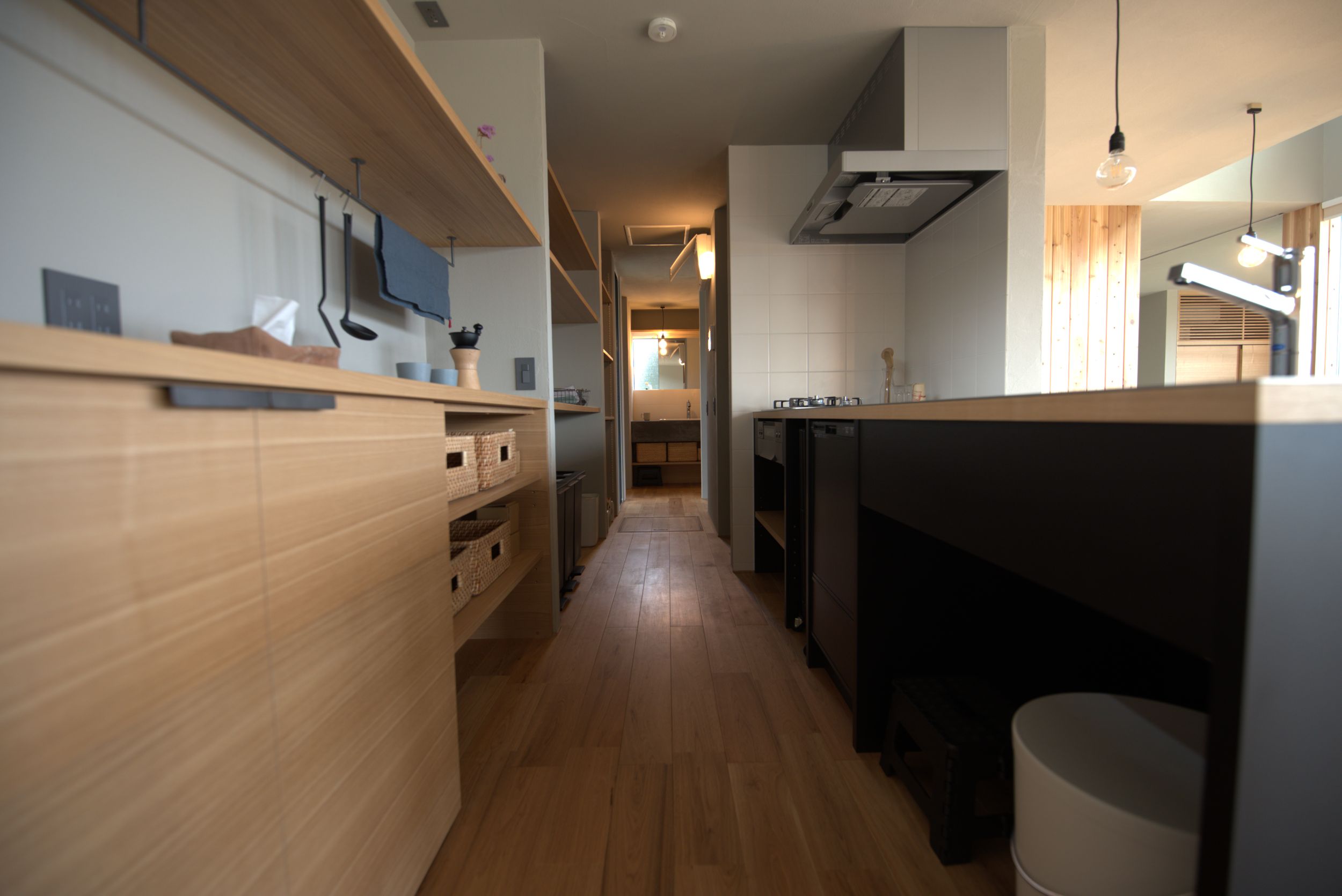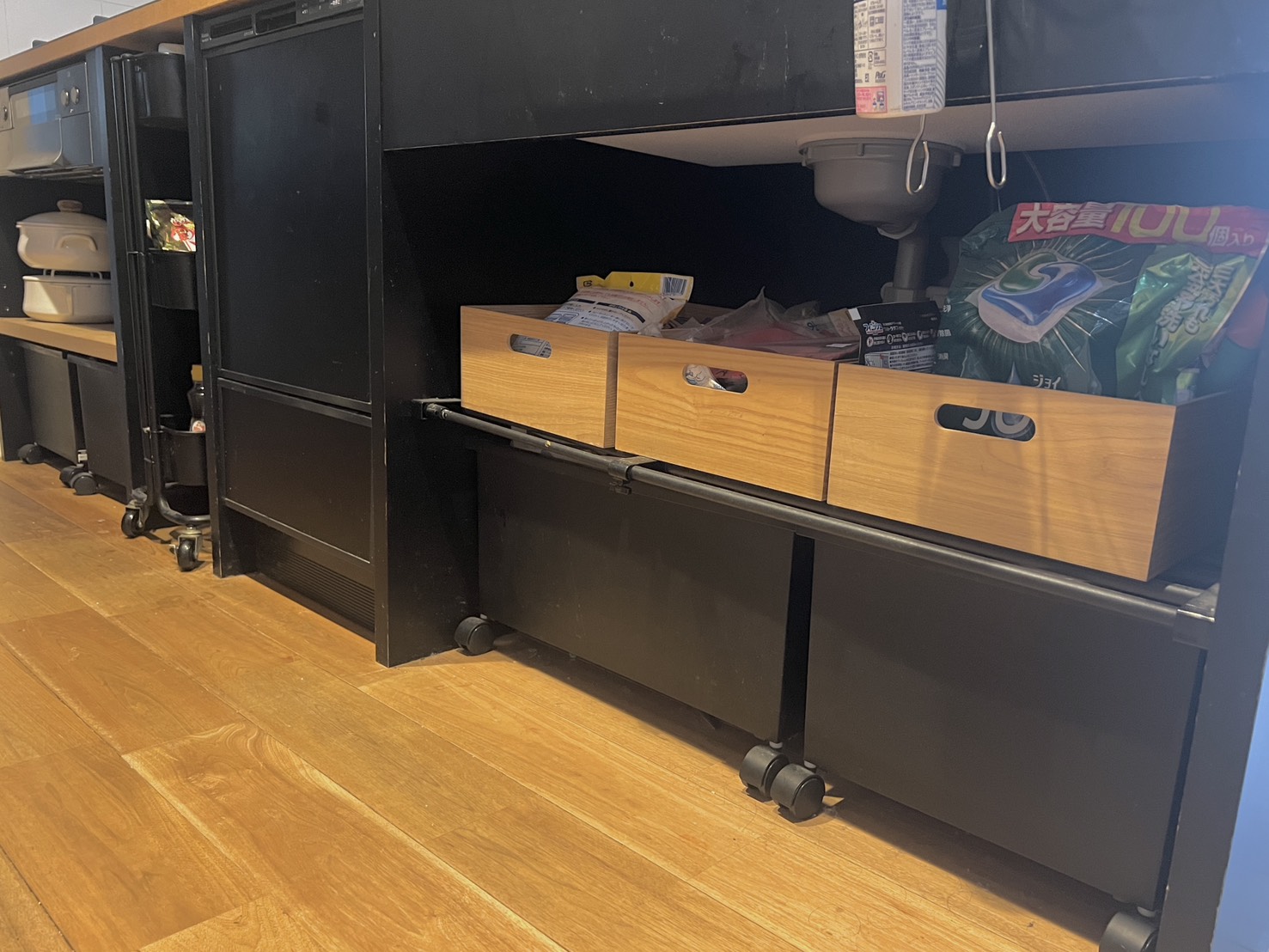 リビング同様にキッチンも暮らしていく中で試行錯誤しながら収納場所をつくっていきました。我が家のキッチンは造作で引き出しなどはなしで「収納スペース」だけつくってもらっていますので、鍋を置いている棚の下にキャスター付きのボックスを追加したり、シンク下は突っ張って取り付けるタイプの伸縮棚を取り付けて上下にボックスを置いたりと収納スペースの確保をしています。