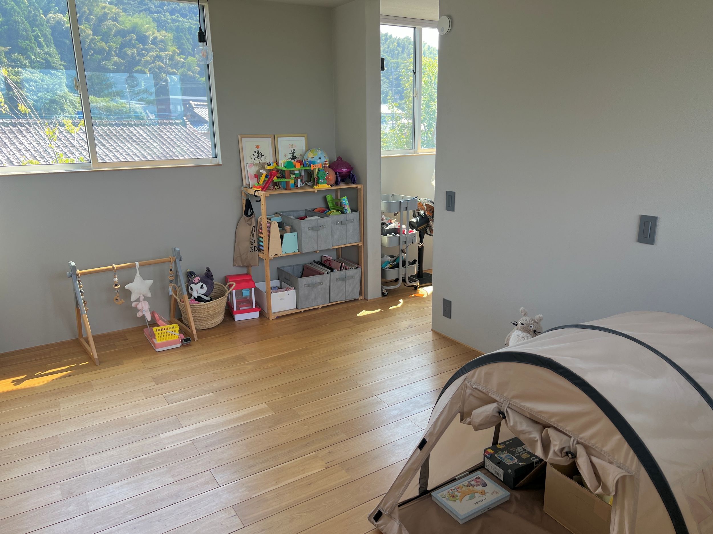 子供が2人になり遊ぶスペースを確保するために、今はキッズテントは2階のフリースペースに移設しました。スタメンでないおもちゃもこの空間に置いています。休日の朝に2階で洗濯を干していると子供たちも一緒に付いてきてフリースペースのおもちゃで遊んでいたりもします。ちなみに将来的には子供部屋として使う予定のスペースです。