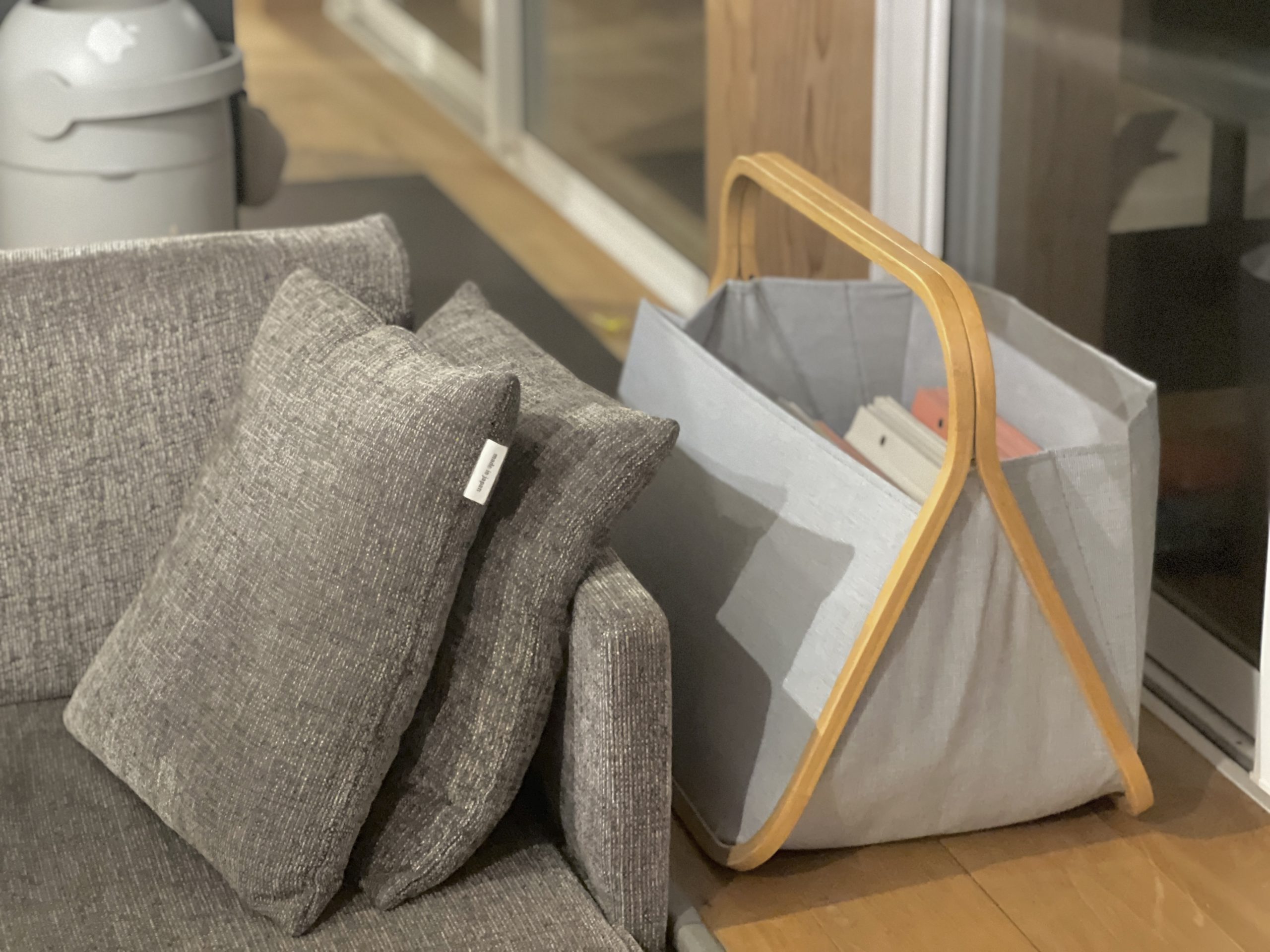 ソファサイドには布製の大き目のバスケットを置き、ここにはアルバムやブランケットなどを収納しています。たまにソファでくつろぎながらアルバムを開いて子供の成長にどっぷり浸る時間を過ごしています。