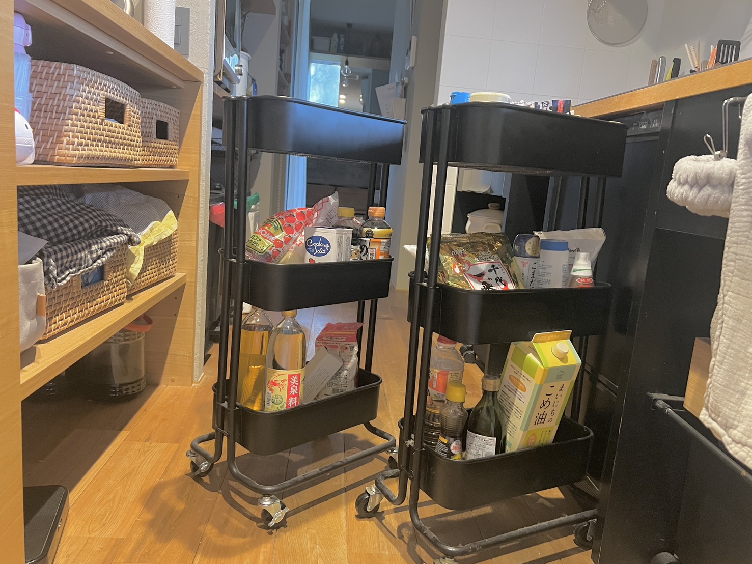 キッチンの収納で1番驚いたのは、調味料を入れているスリムなワゴンが縦列で2台入ったこと。プラン中におさまりの都合で奥行深めのキッチンになったのですが、それが功を奏してワゴン2台を隠せています。お陰様で手前は普段使う調味料を、奥にはストックの調味料が置けて最高です。