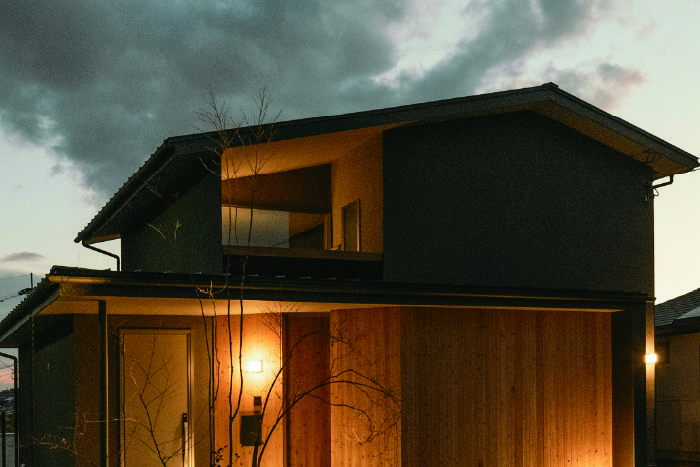 県道に面した北側外観。ガルバリウムの外壁に天然木をアクセントにしたシンプルなデザイン。